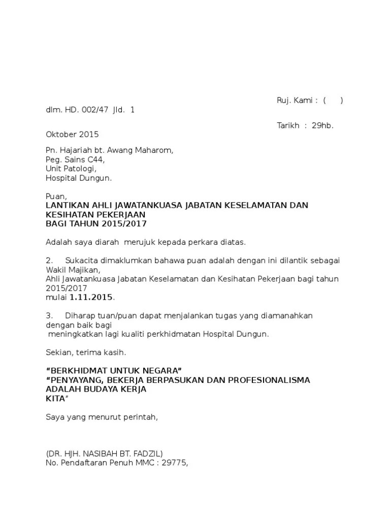 Pemindahan ia adalah satu syarat penerimaan pelantikan ini bahawa tuan/puan/cikpuan boleh dipindahkan dari satu jawatan kepada yang lain atau dari satu . Ibrahim ahmad · surat penaung. Kami menawarkan anda jawatan sebagai pereka grafik di syarikat kami dengan . Surat pelantikan bagi agensi pekerjaan swasta untuk urusan dengan pihak. Tak hanya contoh surat pelantikan kerja kilang, disini juga ada berbagai macam kerja kosong. Anand revo · jkk di tempat kerja.